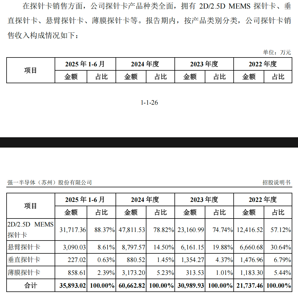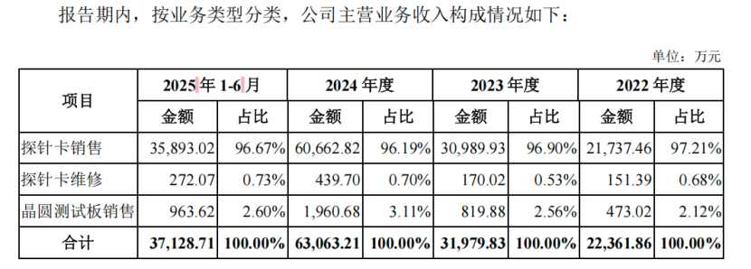 据招股书显示,2022年至2025年上半年,探针卡销售收入占主营业务收入的比例一直超过96%,始终维持在极高水平。其他业务如晶圆测试板销售和探针卡维修合计占比不足4%,对公司收入构成影响甚微。